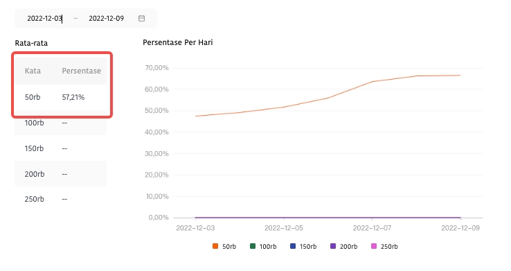 Misalnya: jika kamu ingin mengetahui apakah data retensi di jumlah kata dasar itu pada bulan November 2022 memenuhi persyaratan untuk dapat bonus, kamu dapat memfilter 03-12-2022-09-12-2022 untuk melihat data retensi rata-rata di jumlah kata dasar tersebut.