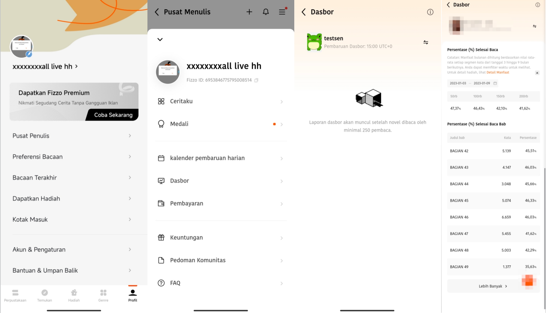 Login ke Aplikasi Fizzo dengan akun penulis, klik "Pusat Penulis"-"三"-"Dasbor"